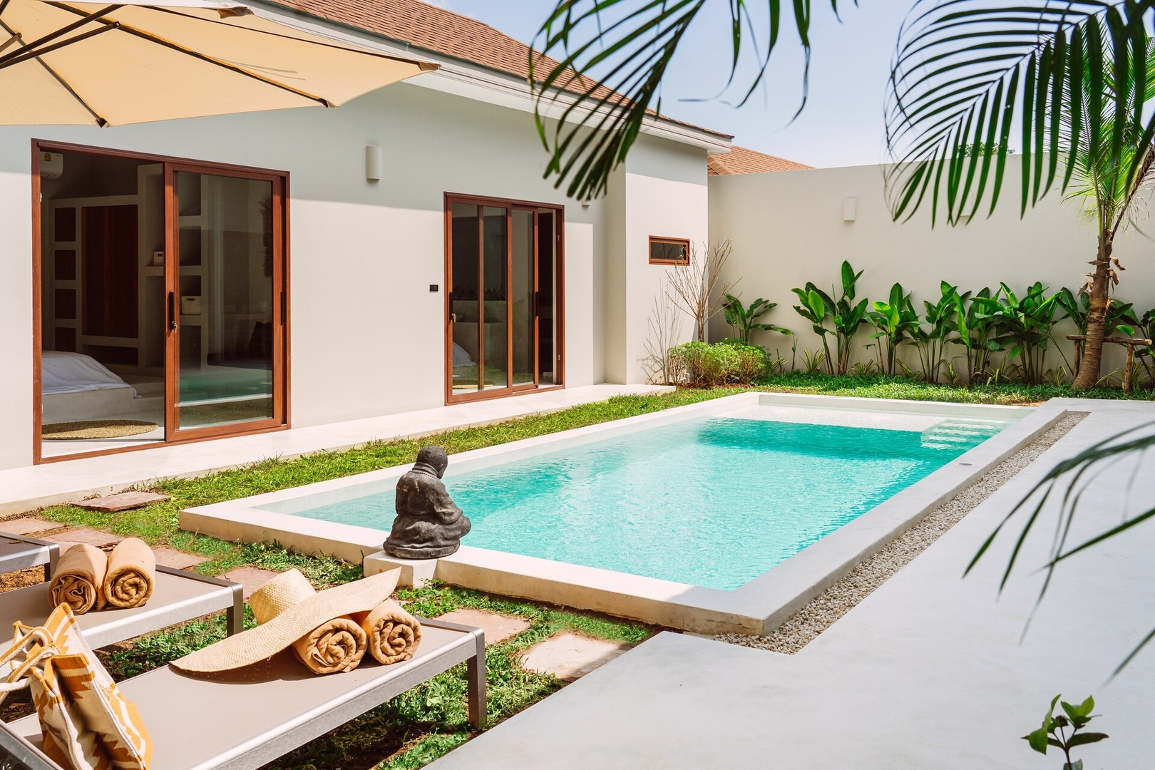 The villa features a private swimming pool with an outdoor shower and a spacious terrace with a dining area, perfect for enjoying meals outside. The open-plan kitchen is fully equipped and air-conditioned for your comfort.